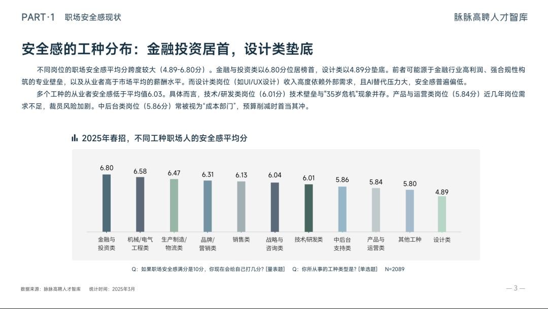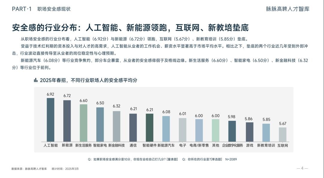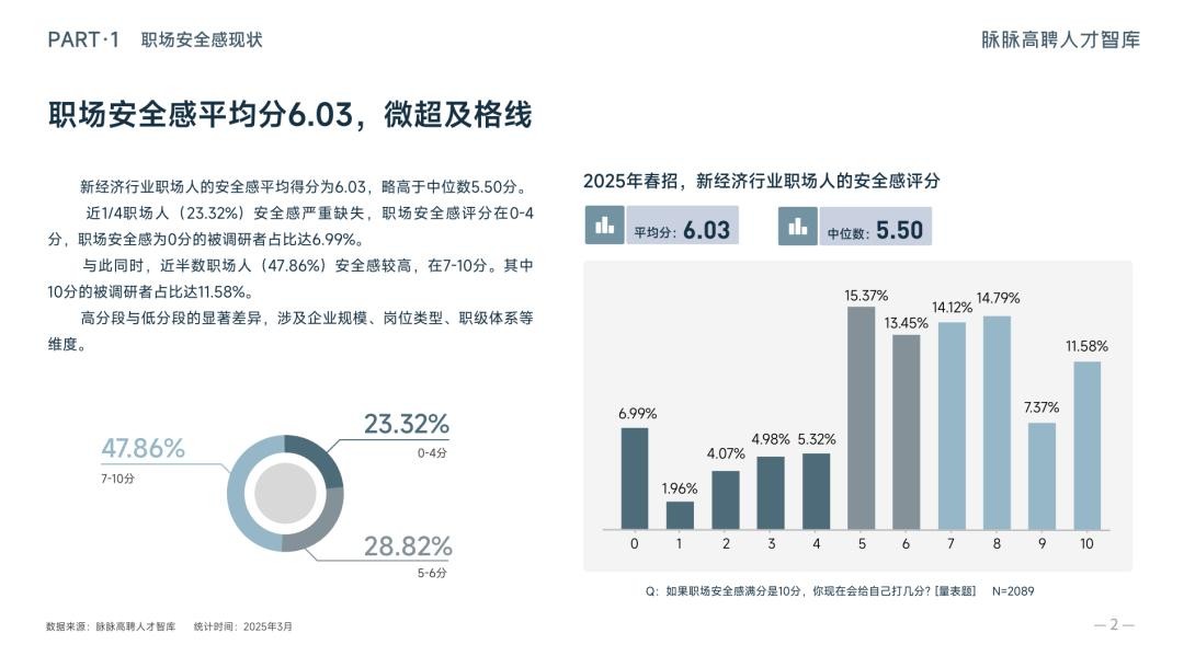 脉脉高聘人才智库发布《2025春招职场安全感洞察》显示,2025年1-2月,新经济行业人才供需比为2.27,超2人竞争1个岗位。新经济行业被调查者职场安全感平均分为6.03分。从行业看,人工智能(6.92分)、新能源(6.72分)、新生活服务(6.60分)等行业被调查者职场安全感较高,游戏(5.86分)、新教育培训(5.85分)、互联网(5.67分)等行业被调查者职场安全感较低。从岗位看,金融与投资类(6.80分)、机械/电气工程类(6.58分)等岗位被调查者职场安全感较高,产品与运营类(5.84分)、设计类(4.89分)等岗位被调查者职场安全感较低。