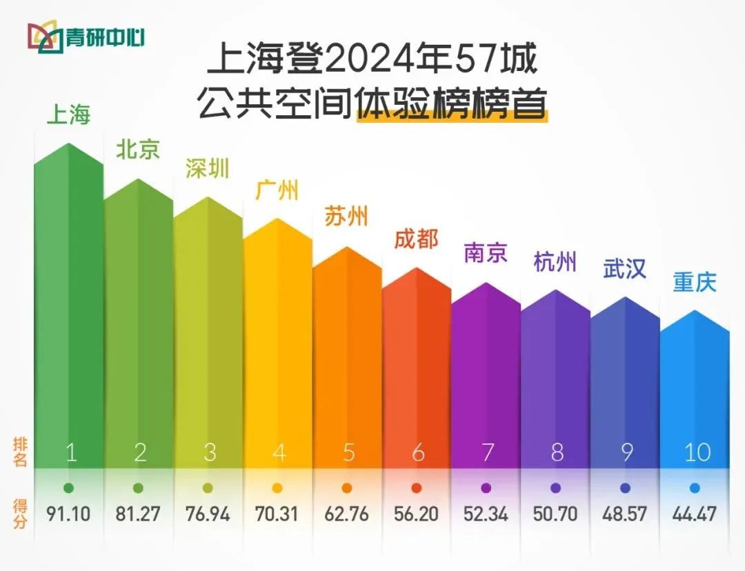 南方周末城市(区域)研究中心发布《57城公共空间体验榜2024》,以生活舒适、市民引力、市民待遇和公共空间体验4个维度为评价指标,报告显示,2024年57城公共空间体验TOP10由高到低为:上海、北京、深圳、广州、苏州、成都、南京、杭州、武汉、重庆。