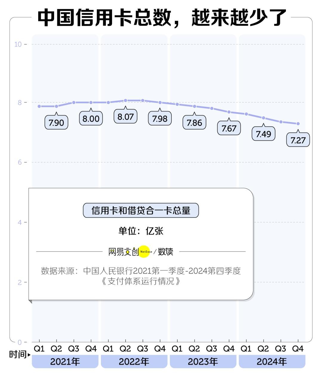 自2022年第三季度开始,信用卡和借贷合一卡总量九季度连跌,到2024年末仅剩7.27亿张。换言之,两年半时间里8000万张信用卡蒸发了。