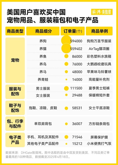 4月13日至17日,家电、户外运动、宠物用品、发制品、健康与美容、数码摄影、安防等品类同比上周 GMV 显著增长。家电增幅达962%,是增长最多的品类。从中国发往美国订单量最高的 100 种商品来看,美国消费者偏爱中国生产的宠物用品、服装、鞋子、包和电子类产品等。
