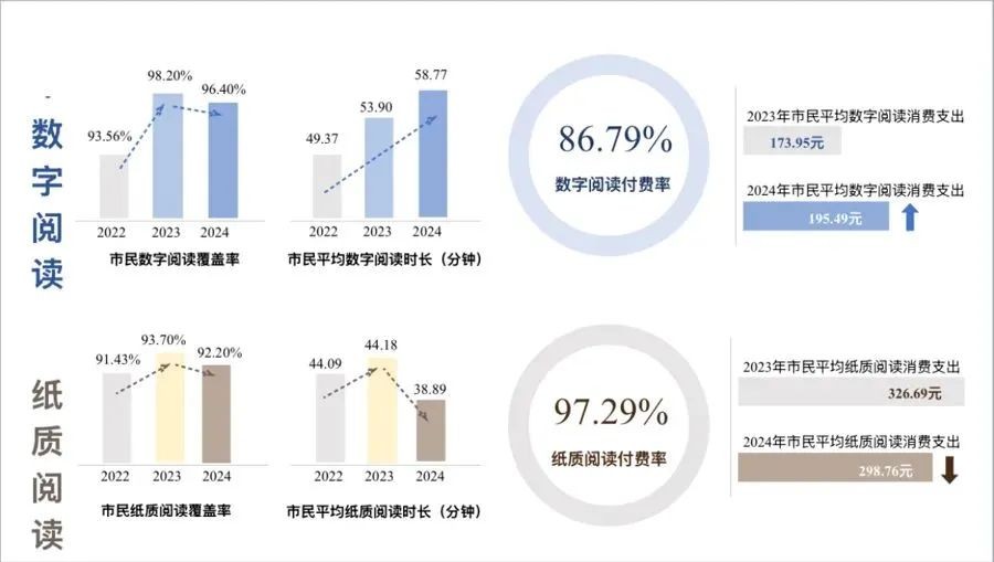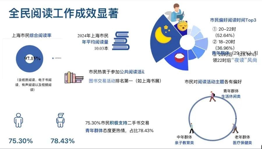 调查显示,2024年上海市民综合阅读率达97.15%,人均阅读量超10本。数字阅读连续三年登上市民偏好阅读方式榜首,数字阅读付费行为愈发普遍。上海书展等图书交易活动受全民追捧,市民参与二手书交易热情高涨。儿童友好阅读空间受欢迎,青年群体夜读趋势初显,银发群体阅读获得感进一步提升。