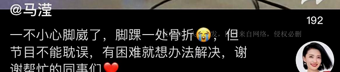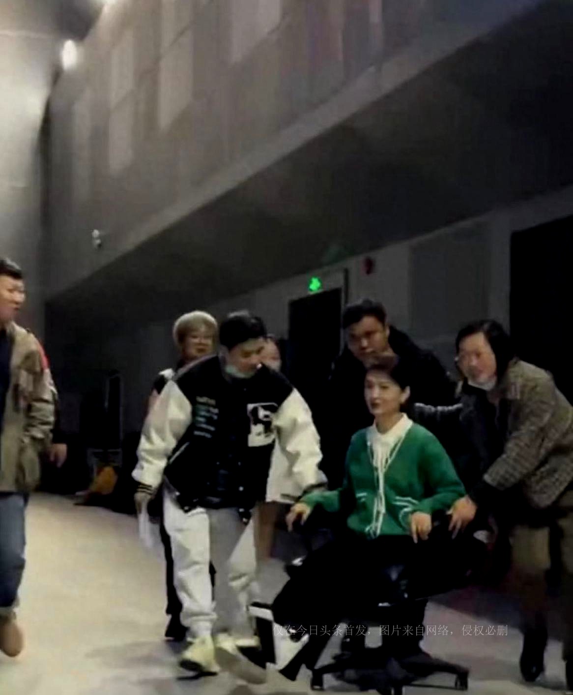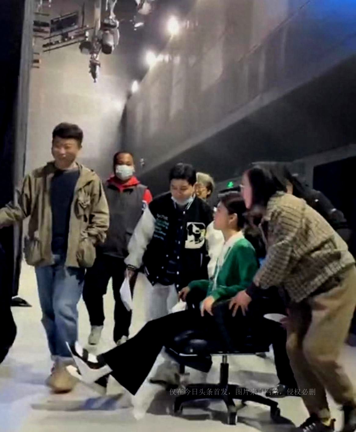 从画面来看,马滢当天打扮低调现身广电大楼,她坐在一个简易的轮椅上,左脚高高翘起,肿得老大。两位工作人员将她缓慢地推进演播室,身后还跟着一位同事帮她随身携带拐棍。虽然身体不适,马滢依旧亲切地和大家打招呼。