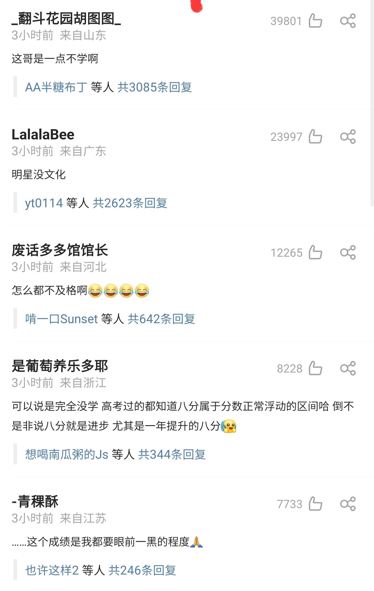 于是开始有网友拿他的单科成绩做文章,暗示艺术生是文盲。