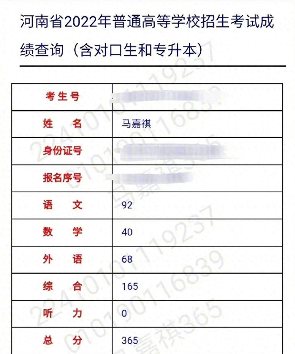 马嘉祺单科成绩分别是:语文92,数学40,外语68,综合165,听力0分。其中数学只考了40分,遭到大量网友嘲讽。