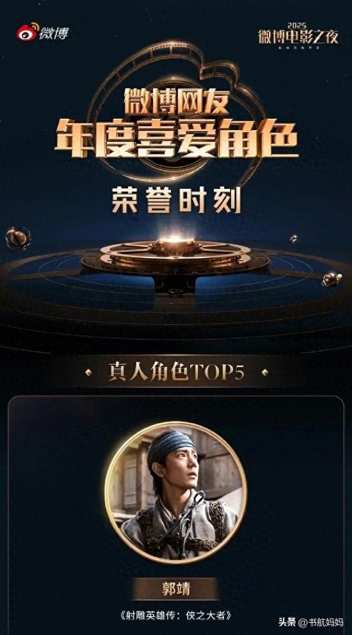 肖战四连冠闪耀全场: 肖战成为当晚最大赢家,强势斩获四项荣誉!他饰演的《射雕英雄传:侠之大者》“郭靖”以深沉家国情怀引爆观众共鸣,荣登“微博网友年度喜爱角色”TOP1;该片同时获评“微博网友年度喜爱影片”;其主演的待映新作《得闲谨制》入围“微博网友年度期待影片”;个人更获网友票选“微博网友年度瞩目影人”。这位非天赋型演员的极致付出终被看见——为呈现郭靖动作戏的真实感,他曾在片场带伤缝针后立即返工。