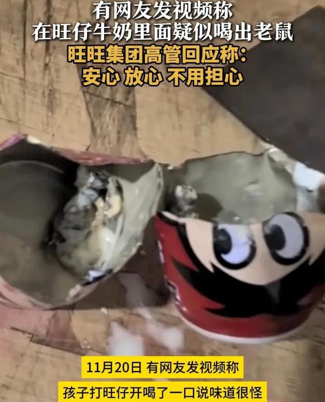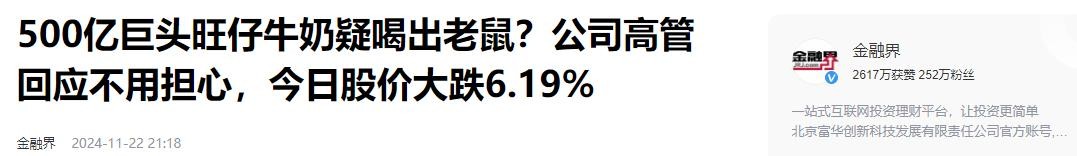 信息来源:金融界 2024-11-22 500亿巨头旺仔牛奶疑喝出老鼠?公司高管回应不用担心,今日股价大跌6.19%