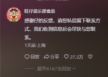 视频的热度上来之后,旺仔的官方也看到了这段视频,第一时间联系了这位家长,想要了解情况解决这件事情。