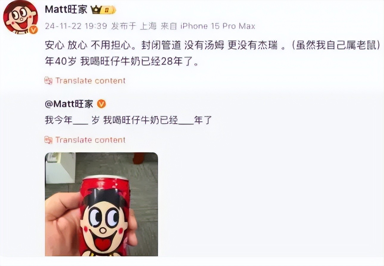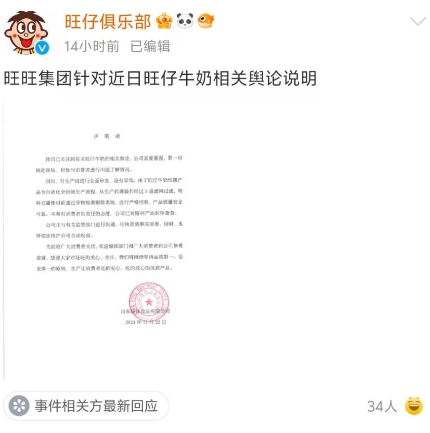 信息来源:微博 2024-11-23 旺仔俱乐部 旺旺集团针对近日旺仔牛奶相关舆论说明