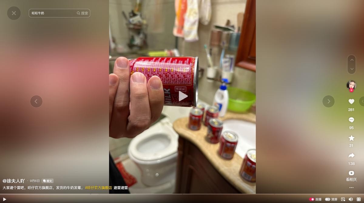 信息来源:抖音 2024-09-06 徐夫人吖 大家避个雷吧,旺仔官方旗舰店,发货的牛奶发霉