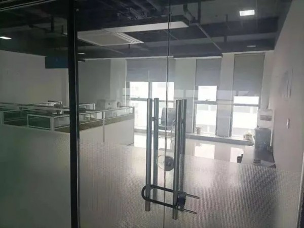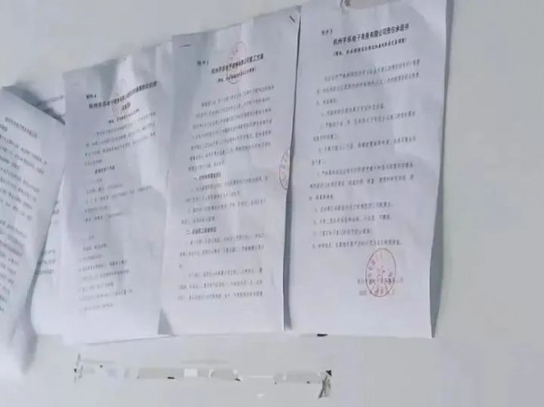 透过玻璃门可以看到房间里保留着电脑和打印机等少量物品,墙上还贴有抬头为杭州手乐电子商务有限公司的承诺书