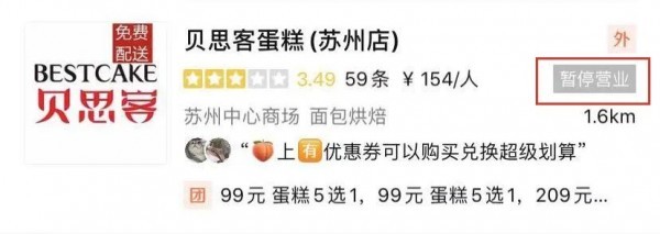 据某点评网显示贝思客蛋糕(苏州店)暂停营业