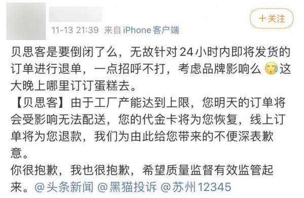 网红蛋糕“贝思客”被曝无人配送、券用不了、投诉爆单……最新回应