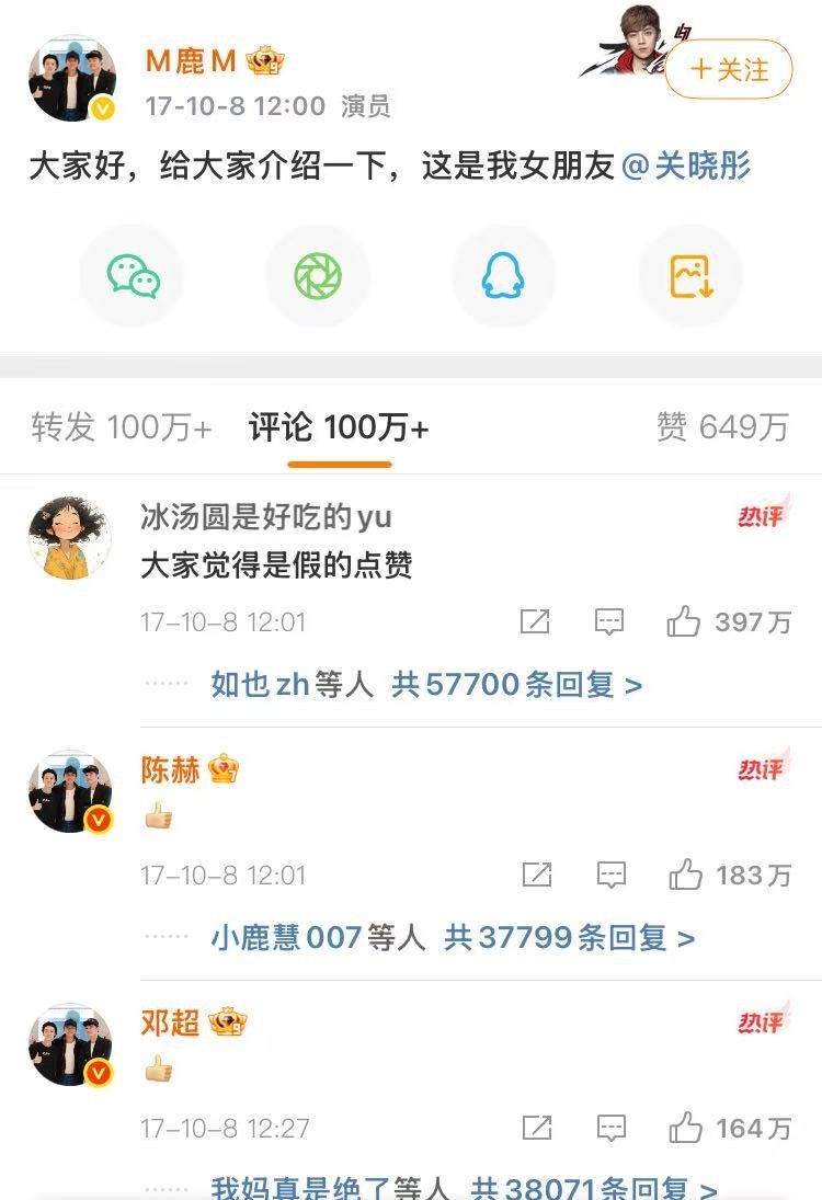 2017年10月8日,国庆假期的尾声鹿晗在微博官宣与关晓彤的恋情,在娱乐圈内引发核爆级别的震动,巨量的信息流导致微博瘫痪,新浪程序员结婚被迫上班,各大社交媒体都被屠屏。