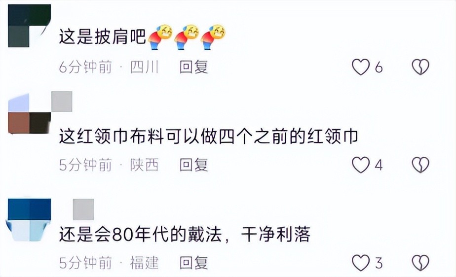 对于这种新的佩戴方式,许多网友表示无法接受,认为这样并不精神、也不够整齐,甚至有人调侃说,这简直就是披肩,根本就不是佩戴红领巾。