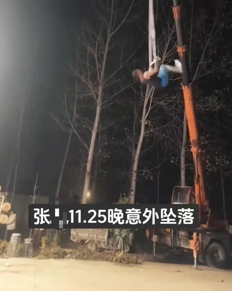 网友发布的视频显示,当时张某双手拽着挂在吊车长臂上的两条绸带,在空中快速翻滚,突然绸带脱落,张某重重的摔到地上。