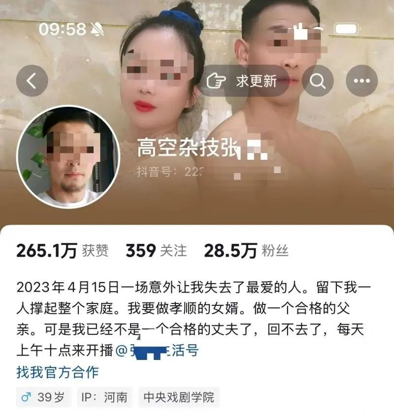 张某的抖音号简介提到,“2023年4月15日,一场意外让我失去了最爱的人。留下我一个人撑起整个家庭。我要做孝顺的女婿,做一个合格的父亲……”据了解,张某的妻子也是一名杂技演员,2023年4月15日,张某夫妻两人搭档在安徽宿州表演高空节目时,妻子坠落受伤,被送至医院抢救无效死亡。