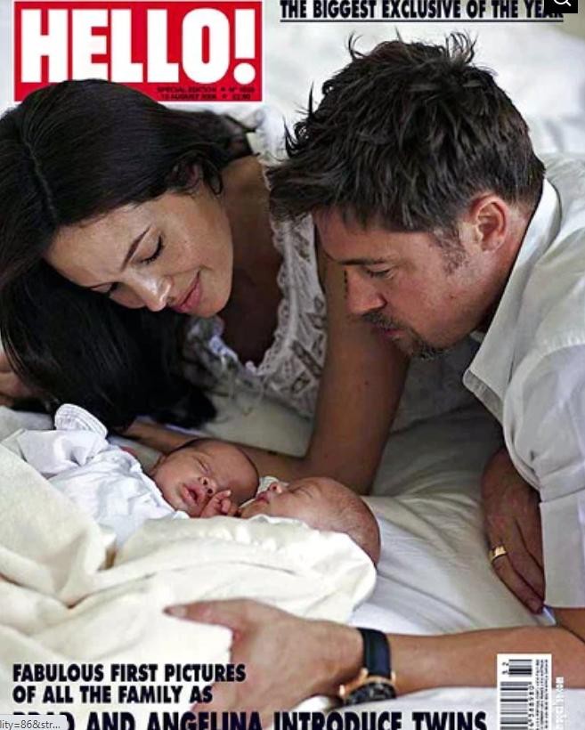 在戛纳电影节上映《功夫熊猫》首映后仅两个月后,双胞胎诺克斯(Knox)和薇薇安(Vivienne)出生了。这对夫妻与Hello杂志分享了双胞胎荧屏的第一张照片,据报道当时价格为1400万美元,是有史以来最昂贵的名人照片。此时,他们共有六个小孩,三个是亲生的,三个是参加人道主义慈善活动地区收养的。