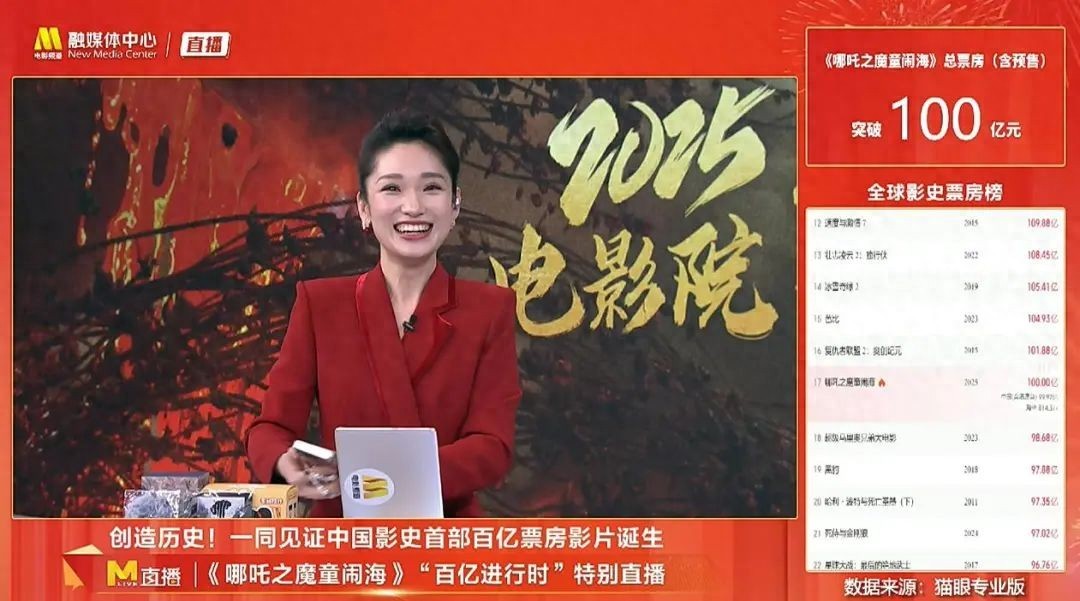 网上大量网友拿着手机刷屏,电影频道甚至还开了专门的直播间,只为一起见证《哪吒2》的票房突破100亿。