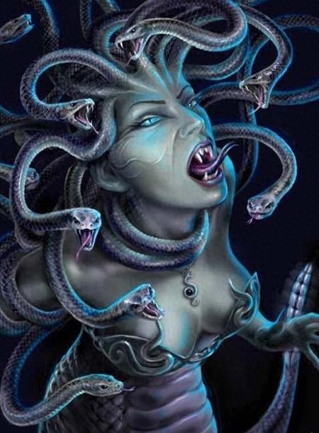 传说中美杜莎和她的两个姐姐都是蛇发女妖,目光狠毒,满嘴獠牙。