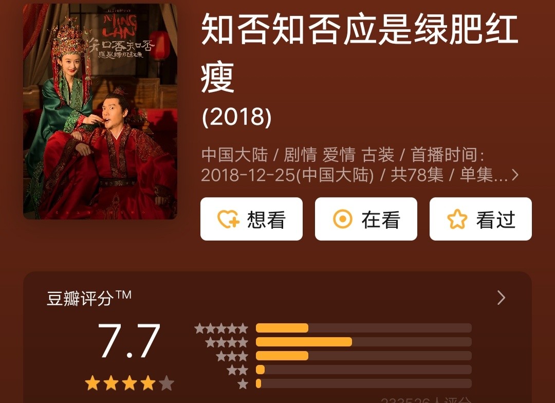 我想谈谈《知否》,豆瓣评的7.7分太低了,它是古装家庭剧的标杆