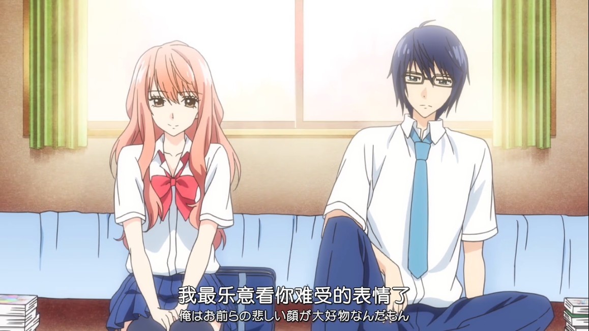 接下来又是甜死人的一幕,色叶直接扑过来和小筒KISS。老白告诉你们很多次了,如果征服死宅,那就是主动主动再主动,如果色叶不主动吻上去,小筒是绝对不可能吻她的,这一点身为宅男的老白深有感触。算了,不想说了,越说越心塞,这部番的狗粮真的多得难以接受,甜死人不偿命!