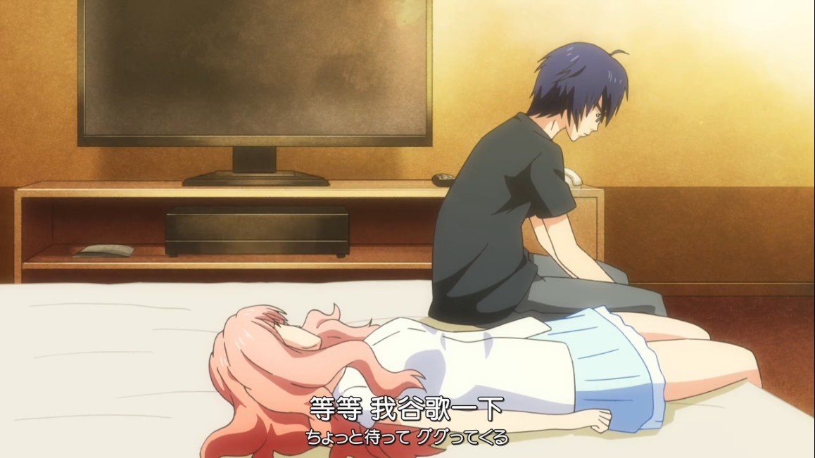 小筒带色叶回来之后就来到了他的房间,在上一集老白就说过,宅男是不懂怎么恋爱的,只能由人引导,而这个引导小筒恋爱的人就是色叶。色叶在小筒房间里说和小筒一起看他喜欢的动漫,看到这一幕真的是特别感人啊,能遇到一个不嫌弃自己爱好善解人意的女孩真好!