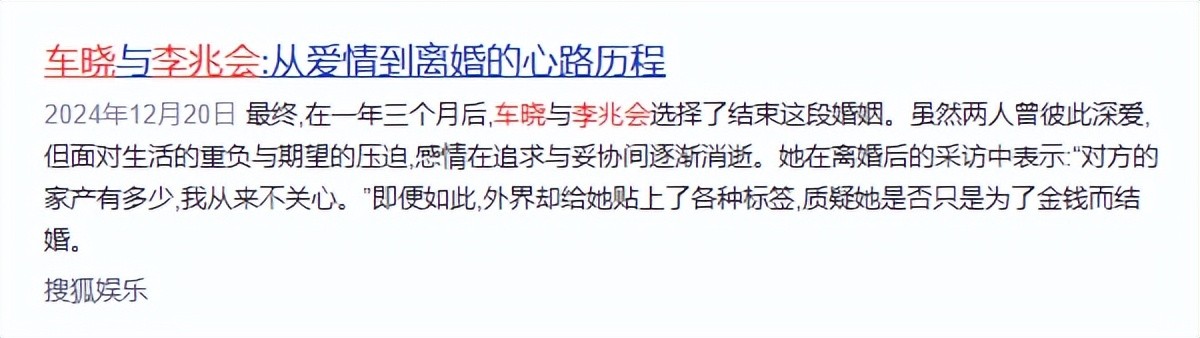资料参考:2024-12-20搜狐娱乐——车晓与李兆会:从爱情到离婚的心路历程
