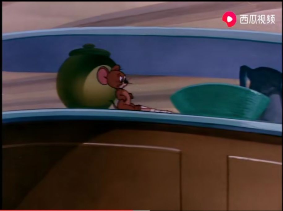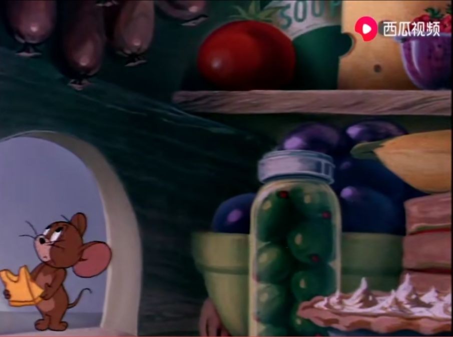 杰瑞的身后是一大堆的食物,我们可以猜测一下,这些食物是什么时候被杰瑞拿到手的,在被汤姆抢走面包之前?还是之后?其实中国版这里有了很大的删减,杰瑞最后的魔性笑容不见了,而镜头也到此为止,在我小时候看的版本中,镜头继续拉长,杰瑞的身后是一个一个对于他来说无比巨大的罐头,奶酪,水果,肉,而在最后一个镜头中,杰瑞魔性的笑容似乎在告诉我们,看看,我也有这么多的物资了