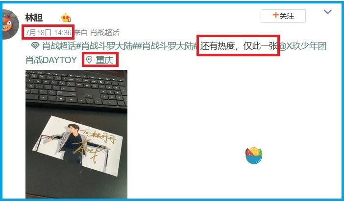 日前,有网友晒出了一张肖战的亲笔签名照片,并附文道:“还有热度,仅此一张”。而微博显示的地点是在重庆。