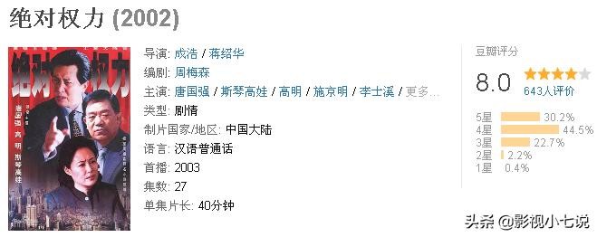 TOP06:《绝对权力》,豆瓣评分8.0,27集,腾讯视频、乐视视频、B站、芒果TV、搜狐视频、优酷视频、爱奇艺视频均可观看。