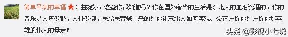 有网友评论说:“曲婉婷,这些你都知道吗?你在国外奢华的生活是东北人的血泪浇灌的,你的音乐是人皮做鼓,人骨做梆,民脂民膏烧出来的!你让东北人如何客观、公正评价你!评价你那英雄般伟大的母亲!”