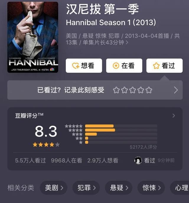 推荐理由:一共四季斩获各类大奖,对威尔和汉尼拔的各种变态心理刻画入微,中间穿插各类离奇凶杀案,每一集都有新的案件出现,画面挑战心里承受能力,精致中带着血腥,每一集都配合汉尼拔医生做菜,食材来源你懂的!毕竟是食人魔医生。