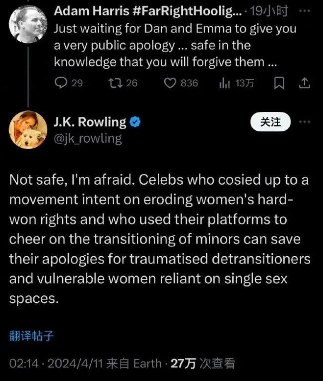 无论是支持 JK 罗琳的观点,还是对她的立场表示质疑,这一事件都提醒着我们,社会问题的复杂性和多样性需要我们以更加开放和包容的心态去理解和对待。