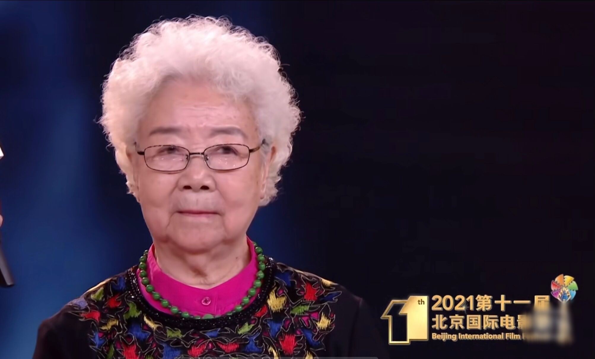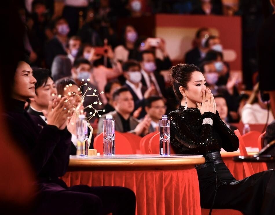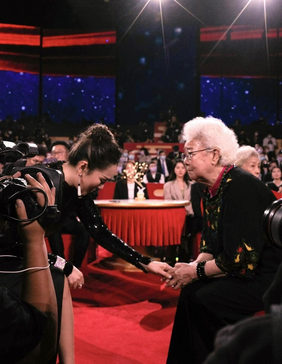 随后,田华、王晓棠及谢芳三位耄耋之年的老人上台发言,台下响起一片掌声。巩俐默默注视着前辈们,眼角早已泛起泪花。