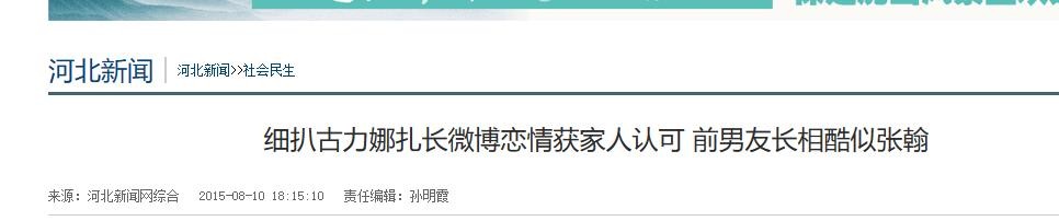 细扒古力娜扎长微博恋情获家人认可 前男友长相酷似张翰 来源:河北新闻网综合 2015-08-10 18:15:10