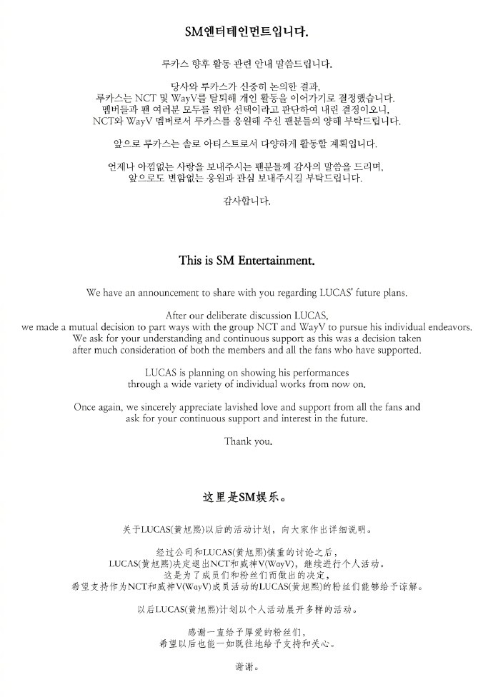 “经过公司和LUCAS(黄旭熙)慎重的讨论之后,LUCAS(黄旭熙)决定退出NCT和威神V(WayV),继续进行个人活动。这是为了成员们和粉丝们而做出的决定,希望支持作为NCT和威神V(WayV)成员活动的LUCAS(黄旭熙)的粉丝们能够给予谅解。