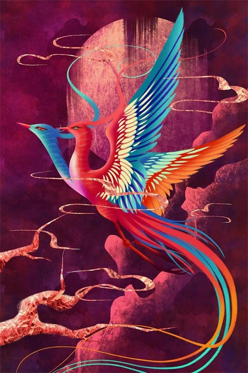 比翼鸟,有两只,一只为青色,一只为红色,双宿双飞。人间有一句话,在天愿作比翼鸟,在地愿为连理枝。