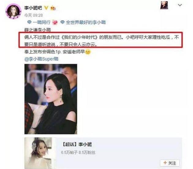 对于两人的绯闻,当时“李小璐吧”回应称,李小璐和薛之谦只不过是合作过某部剧的朋友而已。