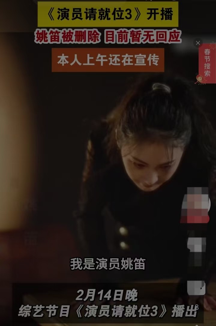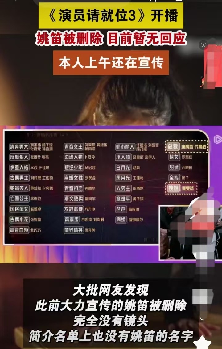 2025年2月14日,本该是《演员请就位3》开播的大日子,但却因为一场“消失”的戏码,闹得沸沸扬扬:女演员姚笛的所有镜头被删除的一干二净。