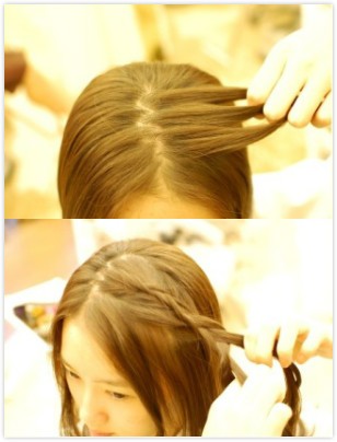 3. 中间分缝,用手指做出Z字型的不规则分缝看起来更加活泼灵动。取三小股头发编成松松的麻花辫。