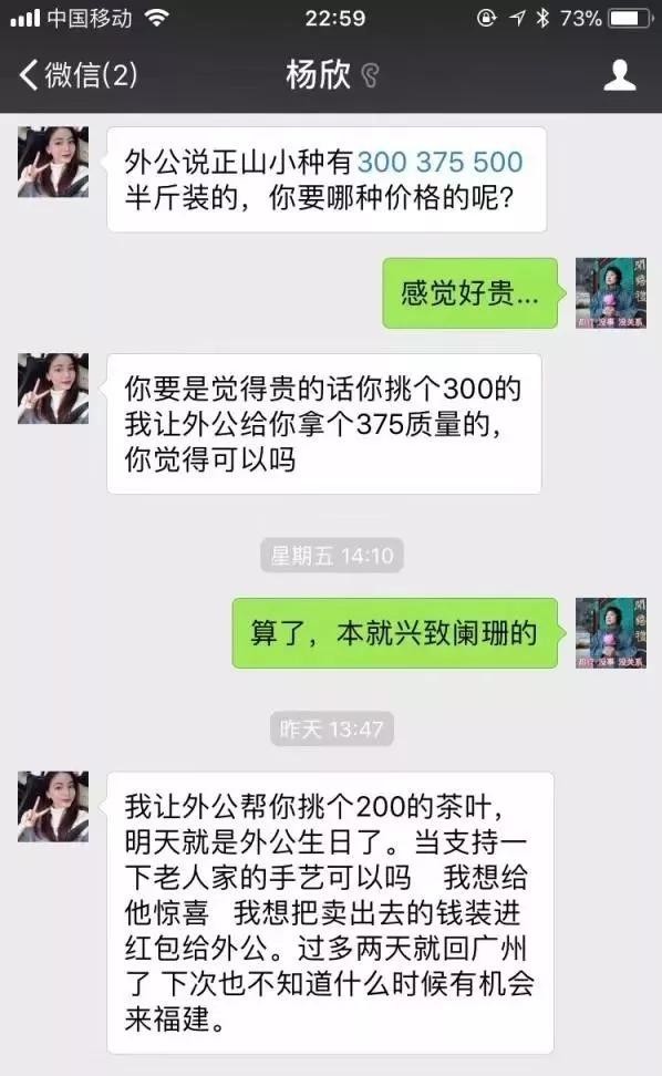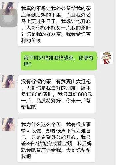 这个时候,骗子十有八九会出现跟你说失恋的情况,哭的伤心欲绝,然后跟你倾诉,让你怜香惜玉,之后会跑到武夷山爷爷奶奶或者外公外婆家中疗伤,帮忙种茶炒茶,学会炒茶叶后决定自立自强,开创自己的事业 —— 炒茶叶,卖茶叶。