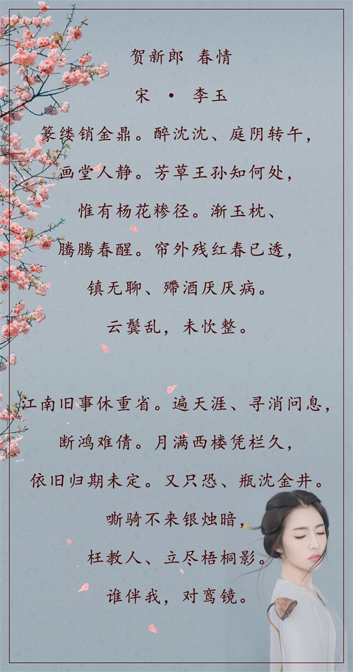 感情的潮水将在她的心掀起更大波澜,也许还是“醉沉沉”的好 。为什么接连不断地重复春天的归去呢?春老花残,闺中人敏锐地感觉自己的青春将逝,红颜将老。