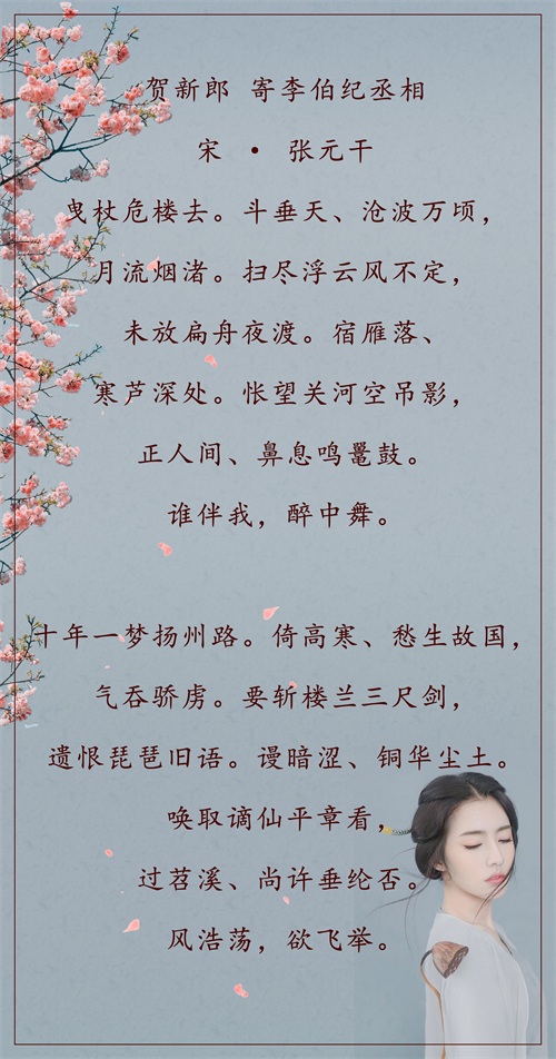 北宋灭亡,士大夫南渡时期,慷慨悲壮的忧国忧民词人们,名篇叠出;张芦川有《贺新郎》之作,先以“曳杖危楼去”寄怀李纲,后以“梦绕神州路”送别胡铨,两词尤为悲愤痛苦,感人肺腑。