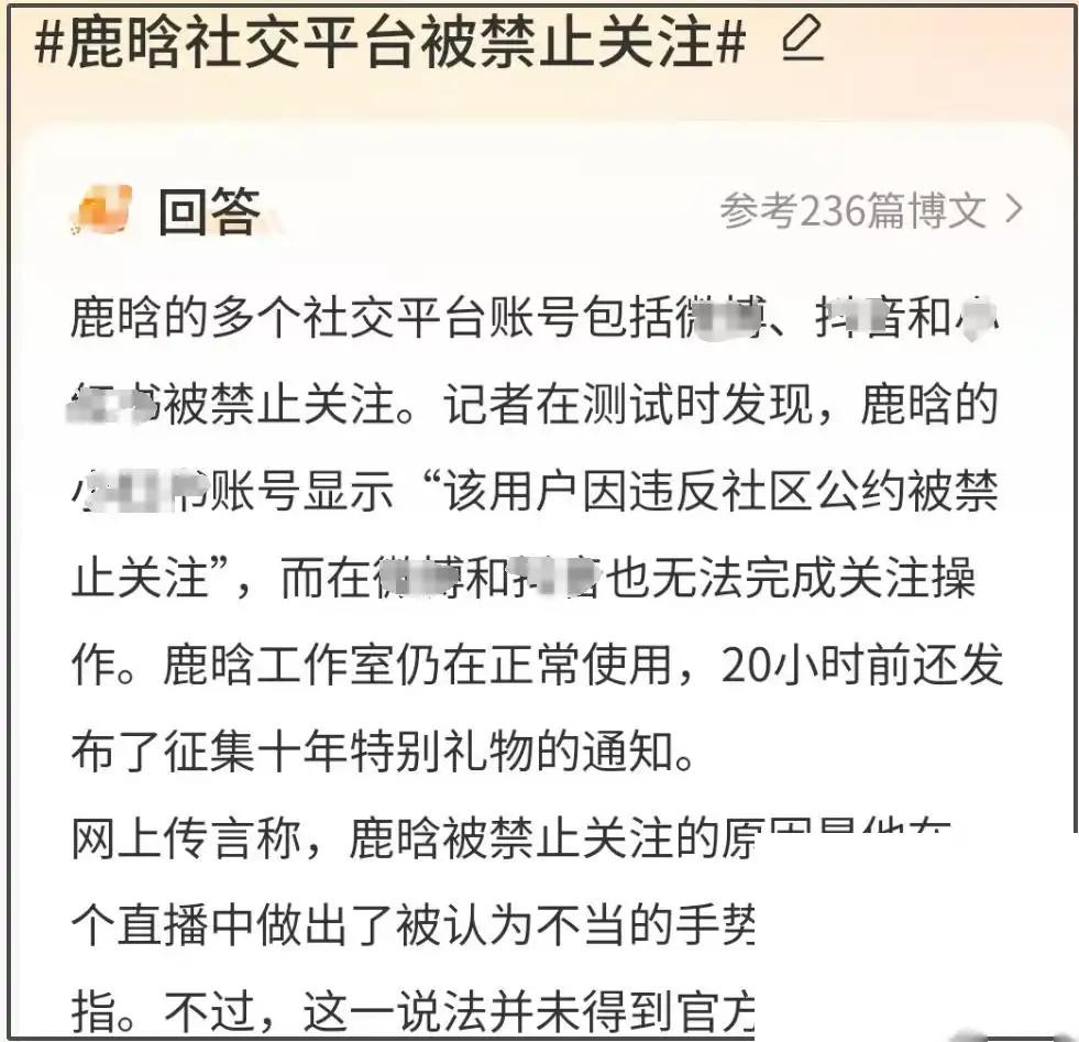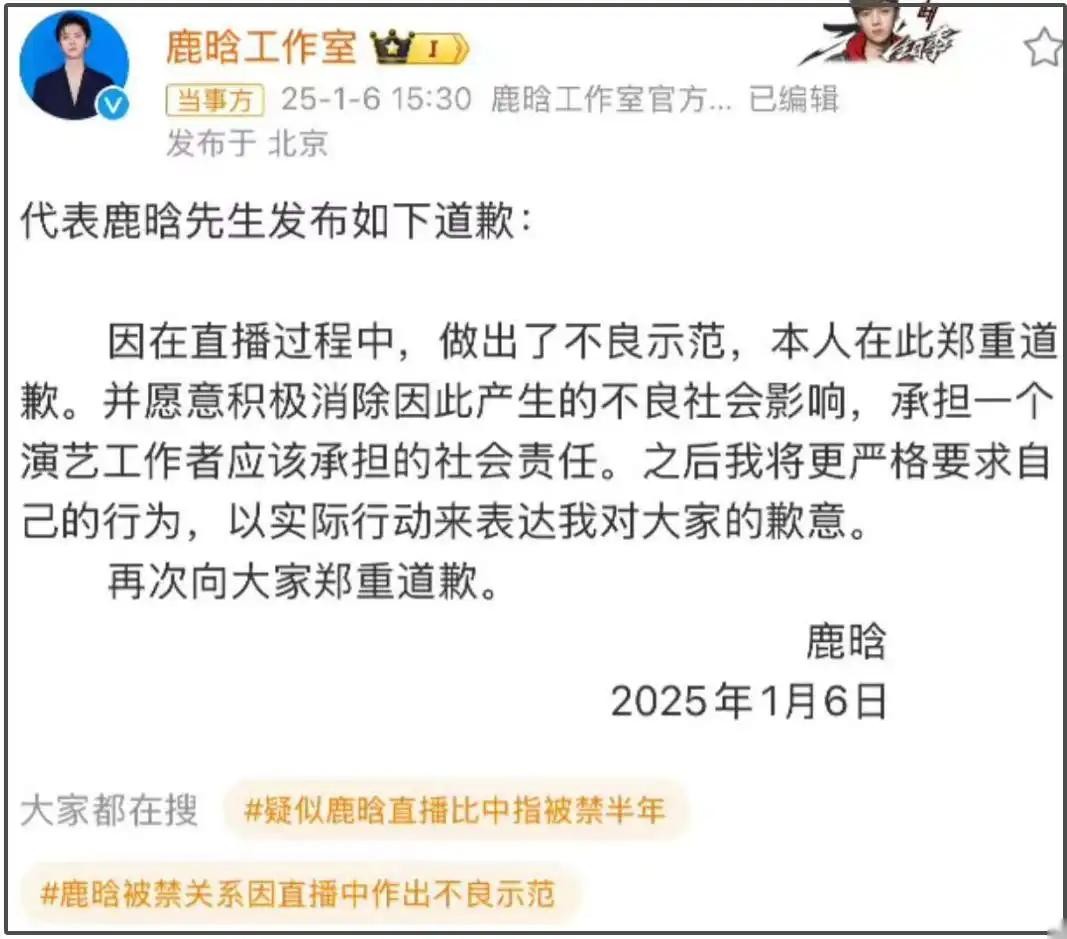 虽说鹿晗三大平台账号都出现了被禁止关注的情况,但只有微博给出了明确的封号原因。而且微博上的封号原因也并不是空穴来风,鹿晗工作室也确实发布了一则道歉声明。