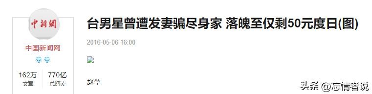 信息来源:中国新闻网 台男星曾遭发妻骗尽身家 落魄至仅剩50元度日 2016-05-06