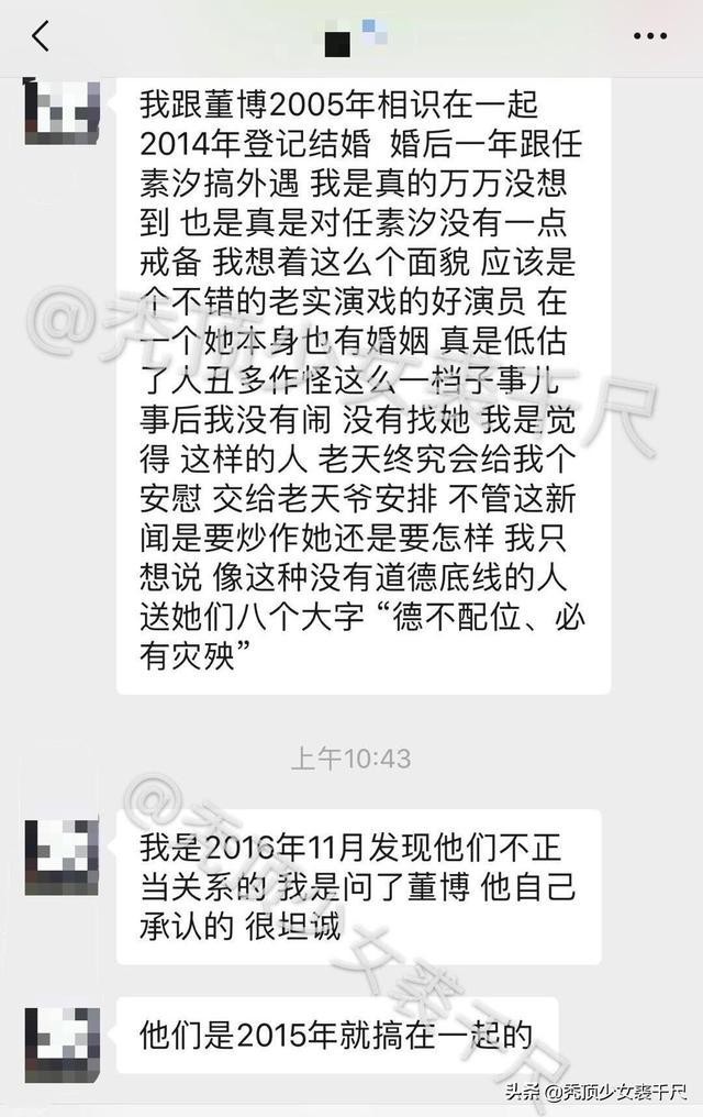 事后,裘裘独家采访到了马琦雅,对方表示“任素汐插足自己婚姻千真万确”,自己与董博与2005年相识,在一起9年时间后在2014年结婚,但在婚后一年董博就出轨任素汐。
