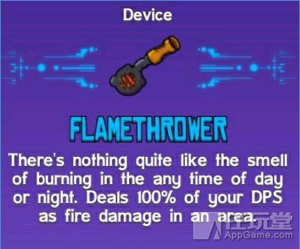 【火焰喷射器】 用途:赋予角色 100% DPS 的物理伤害和火属性范围攻击