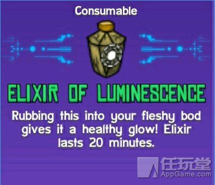 【药剂的发光】 用途: 赋予角色一个健康的辉光肉质 BOD,可维持 20 秒。