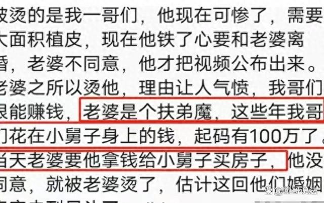 这让我们不禁要问,究竟是什么样的深仇大恨,让这名妻子做出了如此极端的行为?网上有关家暴的传言又是怎么回事?这名女子是否真的是一个“扶弟魔”?让我们一起来深入了解一下这个事件的背后真相。网络上流传的泼开水监控视频实际上是由男子的一位朋友所拍摄,其目的是为了逼迫女子与自己的朋友离婚。在这起事件发生后,男子提出了离婚的要求,但女子却坚决不同意。无奈之下,男子决定公开这段视频,让公众目睹这位女性可怕的一面。
