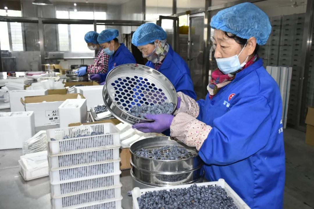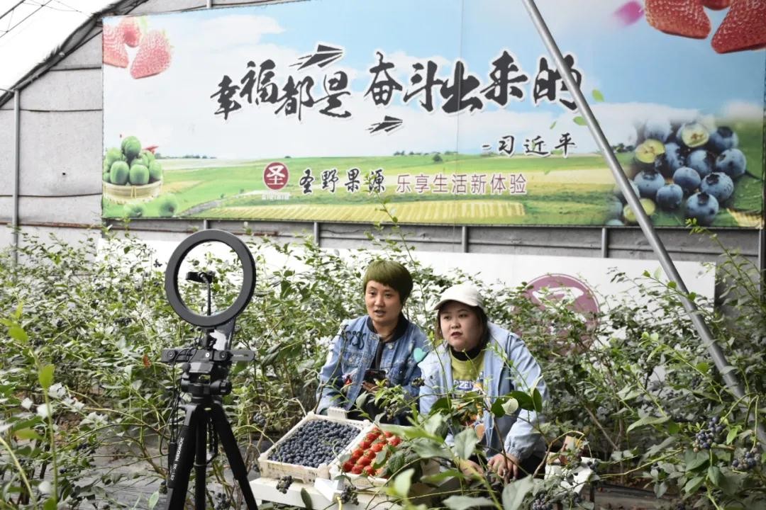 在合作社示范园区包装车间里,农民们根据直播销售订单,将当天采摘的蓝莓分类包装,通过快递销往全国各地②。5月中旬是蓝莓销售旺季。为了保证新鲜的蓝莓、草莓等浆果及时售出,合作社积极搭建营销平台、创新销售模式,对接经济新业态,通过“抖音”网络直播销售,拓宽了销售渠道,提升了当地蓝莓和草莓品牌的知名度。